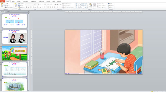 Bước 3: Chạy Slide Show và dạy theo các nút điều hướng – mỗi cụm slide là một “nhịp dạy” (khởi động, hình thành, luyện đọc/viết, chốt bài).