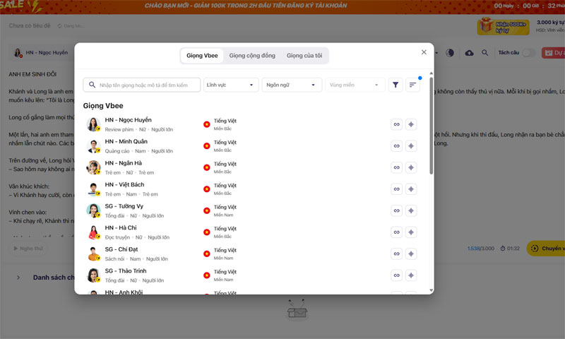 Vbee.vn cung cấp nhiều giọng đọc khác nhau (giọng nam, giọng nữ, miền Bắc, miền Nam...).
